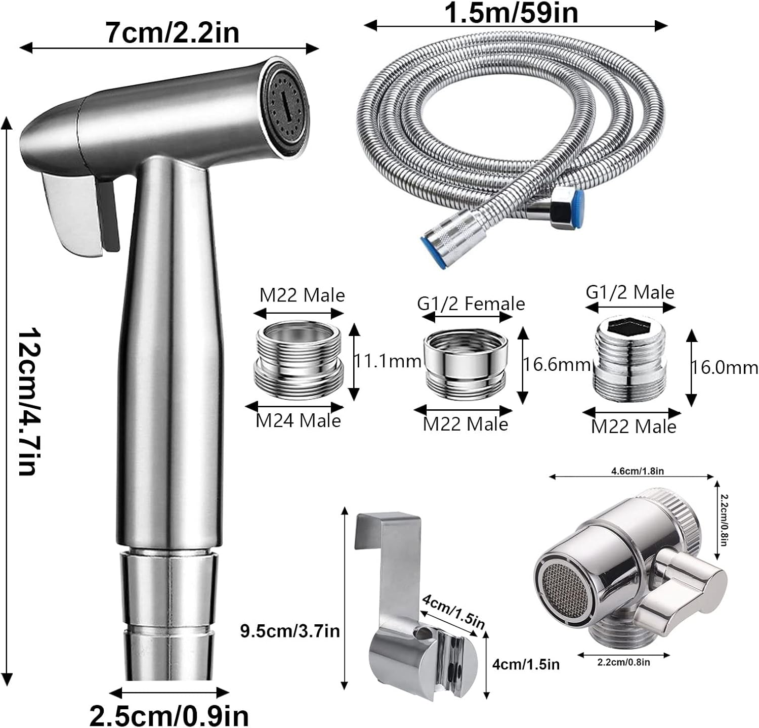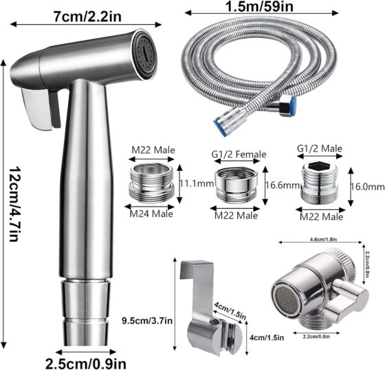 🚽 Pulvérisateur de bidet en acier inoxydable : ce pulvérisateur de toilettes est fabriqué en acier inoxydable SUS 304, durable pendant de nombreuses années, nous vendons également les adaptateurs suivants : M22-M24 mâle (24 mm), M22-G1/2 mâle, M22-G1/2 – Fusil. Convient à la plupart des robinets.