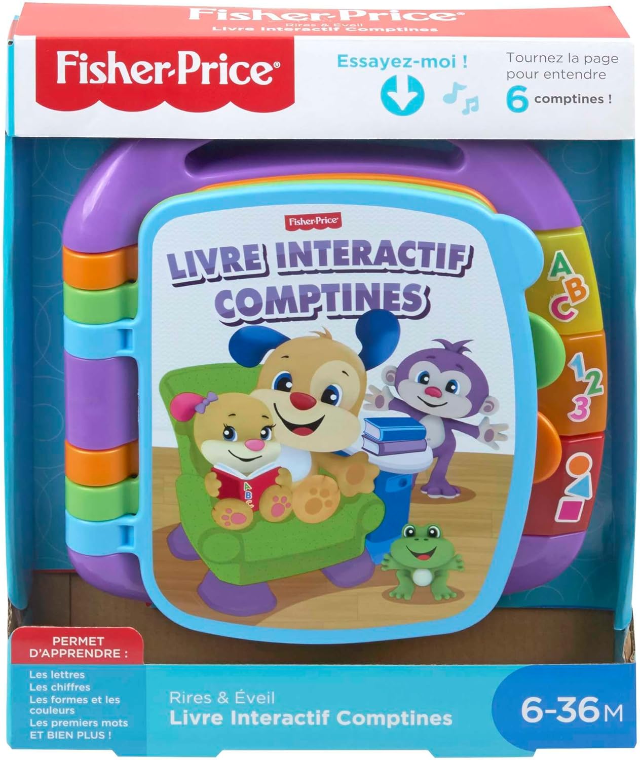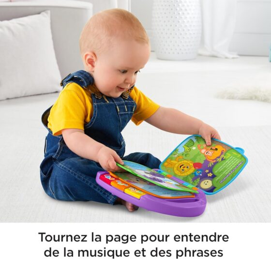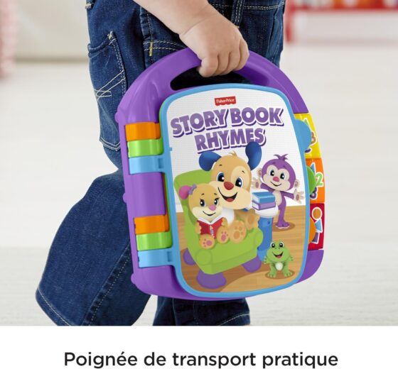 Ce livre interactif, un des livres d’éveil de Fisher-Price, introduit votre enfant à 6 comptines bébé différentes avec des chansons entraînantes et des illustrations colorées qui lui permettront de travailler son ouïe et sa vue. À chaque chanson, bébé se trémoussera et n’aura qu’une envie : tourner la page pour écouter la comptine suivante ! Au-delà des comptines, bébé apprend l’alphabet, les formes, les chiffres et le calcul avec ses nouveaux personnages préférés. Il développe également sa motricité fine en appuyant sur les différents boutons du livre electronique bebe. Quand votre enfant a terminé sa lecture, il peut simplement transporter le livre partout avec lui grâce à la poignée pour pouvoir se remettre à danser à tout moment. De la naissance à 5 ans et plus, Fisher-Price vous propose des jouets pour enfants, filles et garçons, adaptés à toutes les personnalités et tous les âges. Que vous recherchiez des jouets d’éveil, des jeux bébé ou encore un jouet interactif bébé nous vous accompagnons pour trouver le cadeau idéal qui vous permettra d’impressionner vos proches, petits et grands.