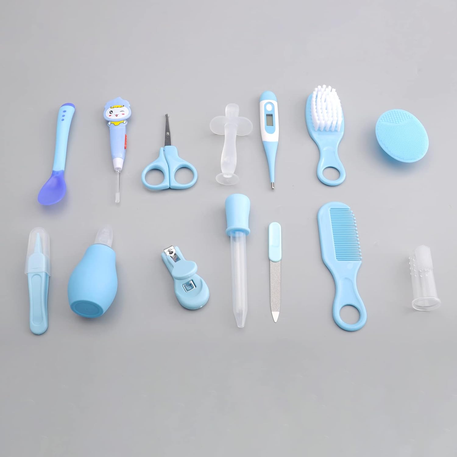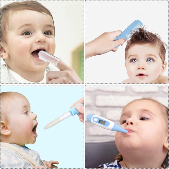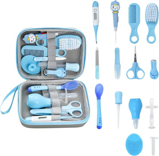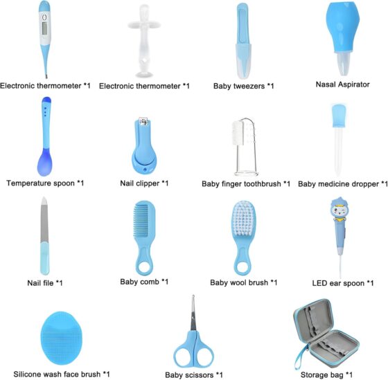 【Kit de 14 pièces】 kit de soins pour bébé pour nouveau-né peut répondre à tous les besoins de soins quotidiens pour bébé, vous recevrez : thermomètre électronique *1 tétine nasale pour bébé *1 pince à épiler pour bébé *1 cuillère à température 1 coupe-ongles 1 brosse à dents pour bébé *1 goutte à médicaments pour bébé *1 lime à ongles *1 peigne pour bébé. *1 laine pour bébé. 1 brosse à oreilles LED 1 brosse de lavage en silicone 1 paire de ciseaux pour bébé – 1 sac de rangementnt.
