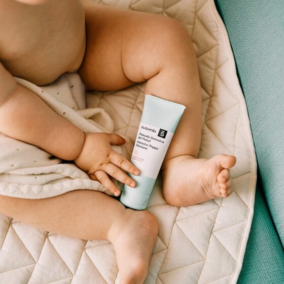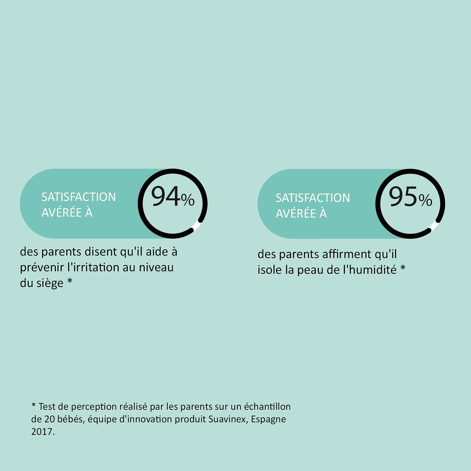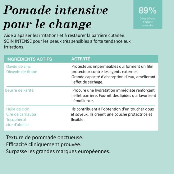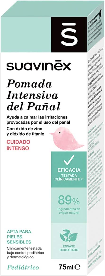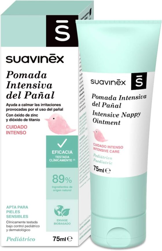 La pommade intensive de change Suavinex aide à apaiser les irritations de bébé et à restaurer la barrière cutanée. Soin intense pour les peaux très sensibles à forte tendance aux irritations. Format 75 ml. Avec une texture de pommade crémeuse. 89% d’ingrédients d’origine naturelle. Ingrédients actifs: – Oxyde de zinc et dioxyde de titane: protecteurs imperméables qui forment un film protecteur contre les agents extérieurs. Grande capacité d’absorption d’eau, améliorant l’effet de séchage. – Beurre de karité: apporte une hydratation immédiate renforçant l’effet barrière. Fournit des lipides qui favorisent l’émollience. – Huile de ricin, cire de carnauba, tocophérol et cire d’abeille: contribuent à un toucher doux et soyeux. Ils créent une couche protectrice et flexible. Efficacité cliniquement prouvée *. 95% des parents affirment qu’il isole la peau du siège de l’humidité et 94% des parents affirment qu’il aide à prévenir les irritations ***. Plus préventif et calmant que la crème de change leader en Espagne et la crème de change leader en Italie *. Surpasse les grandes marques européennes **. Quand utiliser la crème de change et quand utiliser la pommade intensive? – Haute intensité d’irritations: pommade intensive. – Intensité d’irritation modérée: crème de change ou pommade intensive. – Faible intensité d’irritations: crème de change. Parce que chez Suavinex nous sommes vraiment engagés dans le monde dont les générations futures hériteront, nous présentons la 1ère ligne de cosmétiques pédiatriques dans des contenants fabriqués à partir de matières premières renouvelables. Formules plus naturelles (1): avec 86% -99% d’ingrédients d’origine naturelle. (2) Des formules plus durables (1): nous privilégions les ingrédients d’origine naturelle les plus durables, et qui ont le moins d’impact sur l’environnement. – Pour les peaux sensibles. – A utiliser dès le 1er jour. – Testé cliniquement: sous contrôle dermatologique, pédiatrique et ophtalmologique (3). – Testé sur plus de 1000 individus (4). – Textures agréables: faciles à appliquer, rapidement absorbées et avec un arôme subtil. – Des emballages plus durables: des emballages plastiques biosourcés, des cartons recyclés et 100% recyclables et des bouteilles de forme carrée. (1) Par rapport à la formulation de notre précédente ligne cosmétique. (2) Indépendamment de ma première crème pour le visage et baume pour les lèvres. Pourcentage comprenant l’eau. (3) Dans le cas du Gel-shampooing Syndet et du Gel-shampooing moussant. (4) Totalité de l’échantillon utilisé pour le Pach Test, HRIPT et Test d’utilisation réalisés dans les différents produits de la ligne.