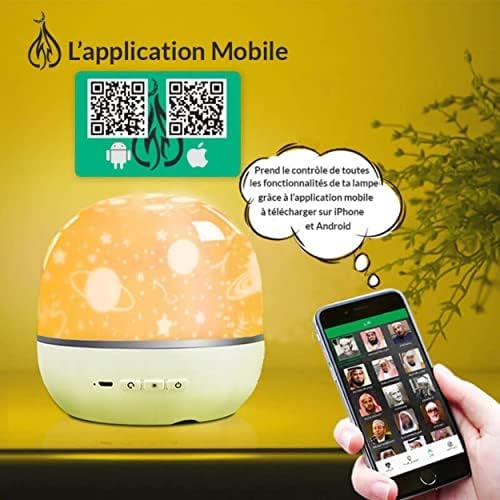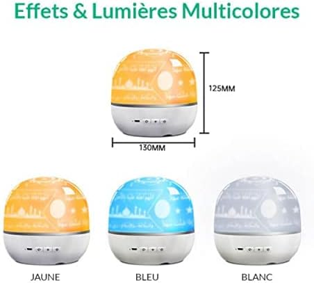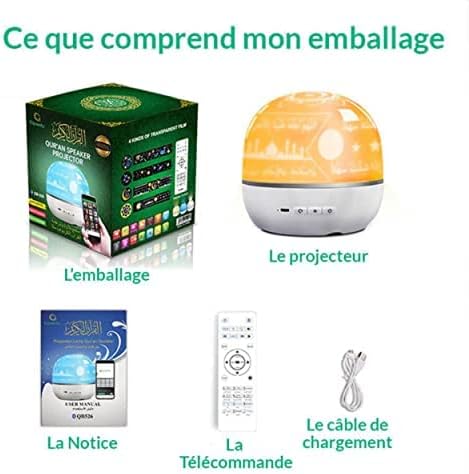 Veilleuse coranique pratique et ludique deux en un : Une lampe de chevet ou en mode projecteur Fonctionnalités : * Coran complet * 4 patrons transparents pour afficher quatre ambiances dans la pièce * Couvercle de la lampe amovible, tu as librement le choix entre le mode projection ou une lampe de chevet. * Projection horizontale (sur les murs) et verticale (sur le plafond) * 3 couleurs au choix pour choisir l’ambiance qui te correspond le mieux. * Lecture du Coran mot par mot ou en play pause. * Lancer la traduction du Coran en choisissant la langue souhaitée * Connexion Bluetooth jusqu’à 15 m * Mode combiné et mode simple disponible. Pour écouter l’audio du Coran et une traduction en même temps à l’aide du bouton MODE * Effleurer le bouton tactile derrière la lune permet le changement des couleurs * Le Coran complet avec 18 récitateurs, ainsi que la traduction de ces sens et son exégèse (Tafsir), Les Hadiths de Sahih Mouslim et Boukari, la citadelle du musulman… Une liste des meilleurs récitateurs : * Abdurahman As-Sudais * Ahmed Al Ajmi * Mishary Rachid Al Afassy * Mohamed Ayyoub * Saad Al Ghamidy * Maher Al Muayqli * Abou Bakr Al Shatri * Mohamed Al Tablawi * Abdallah Matroud * Mohamed Siddiq Minshawi * Abdallah Basfar * Saad Al Ghamidy * Maher Al Muayqli * Ali Al houdhaifi * Mohamed Jibriil * … Traduction en plus de 15 langues différentes Rechargeable avec une autonomie de 4 à 6 heures Accessoires fournis dans l’emballage : * La lampe projecteur * La télécommande (2 piles AAA non fournies) * Câble de chargement USB * Mode d’emploi et notice